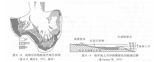 障壁岛沉积物主要为细砂和极细砂沉积,发育平面状低角度层理和槽状交错层理。障壁岛—泻湖是一种重要的海岸类型,很多海域都发育。当海平面发生变化时,障壁岛会发生迁移。