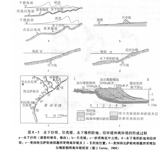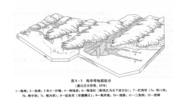 (2)海岸堆积地貌在沙、泥质海岸,海水对海岸和海底进行改造并将沉积物搬运到合适的部位沉积下来就形成了各种堆积地貌。有的形成于海岸线附近,而有的形成于海平面之下。这些地貌的延伸方向即可与海岸线平行,也可与海岸线垂直或斜交,但前者更常见些。
