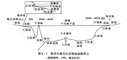 海洋的环境系统非常复杂,从海岸线到深海,由于水深的变化和离陆地越来越远,其环境特点有很大的差别,根据水深和环境特征,从陆地向海洋方向依次分为滨海、浅海、半深海和深海,其海底地貌单元相应称为海岸带、大陆架、大陆坡和大陆基、深海盆地、大中洋脊。