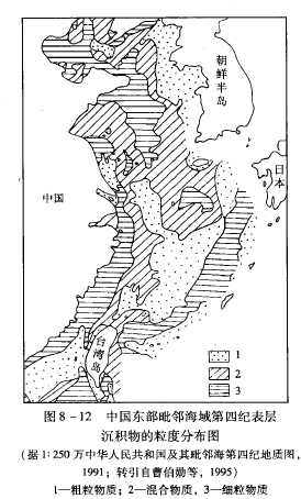 浅海的沉积物包括碎屑沉积、化学及生物化学沉积、生物沉积、火山沉积和残留堆积,其中碎屑沉积、化学沉积、残留堆积和生物沉积最主要。在大陆架上,碎屑沉积分布很广泛,以砂和泥质为主,含少量的砾石。这些沉积物在平面和剖面上具有一定的分布规律。在剖面上,如果是海进,自下而上为逐渐变细;如果是海退,自下而上变粗。在平面上,近岸的沉积物粒度粗,而远岸的细,从近岸到远岸一般依次为砾石→粗砂→细砂→粘土,并呈平行海岸的带状分布。但在我国东部大陆架,由于受到末次冰期海平面下降的影响,在沉积物平面分布上发生了一定的变化。