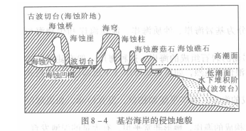 (1)海岸侵蚀地貌海岸侵蚀她貌(coastal erosional landform)是由海水侵蚀作用形成的,主要发育在基岩海岸的岩石中,其类型有海蚀穴、海蚀凹槽、海蚀崖、海蚀柱、海蚀蘑菇石、海蚀拱桥、海蚀礁石、波切台等。