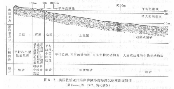 从粉砂泥质海岸的沉积物分布不难看出,由于沉积物的来源主要由潮流带入,因此沉积物的粒度从岸边向海洋方向依次变粗,这与一般的沙滩沉积粒度分布规律相反。