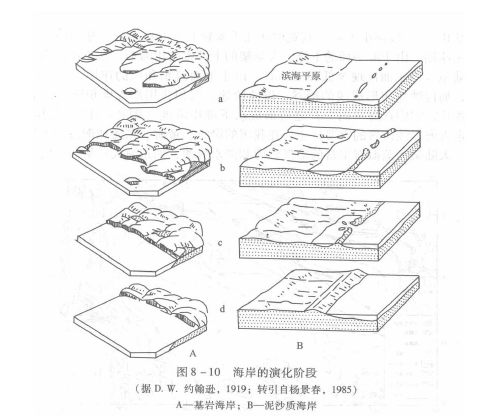 世界各地的海岸形态非常复杂,这不仅受海岸的岩性和新构造运动的影响,还受海平面波动和海水侵蚀作用的影响。如新构造运动的上升区,海岸常陡峭,基岩裸露;而在新构造运动的下降区,海岸常比较平缓,有大量的第四纪沉积物覆盖。海水对海岸的侵蚀作用主要发生在海平面附近,而低于海平面的海水侵蚀作用比较微弱,所以海平面对海岸侵蚀作用具有控制作用。海水对海岸侵蚀作用是随着海平面的波动侵蚀位晋发生变化,从而导致海岸形态变化。如果新构造运动稳定,海平面的位置不发生变化,那么一个基岩海岸的发育过程经历以下几个阶段。