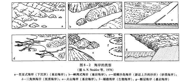 A.N.Strahler 根据海岸的成因和形态分成8种类型的海岸,即里亚式海岸(下沉海岸)、峡湾式海岸、断层海岸、堤障沙岛海岸、三角洲海岸、火山海岸、珊瑚海岸和红树林海岸。