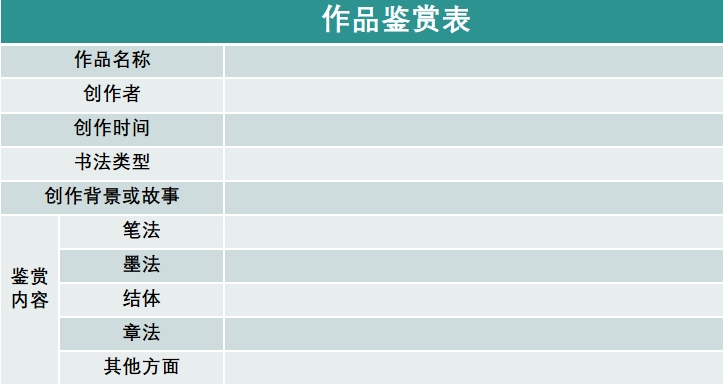 2. 从最初的金石竹刻到变化无穷的毛笔书写,中国书法逐步发展出篆书、隶书、草书、楷书、行书五大书体。这些书体由众多书法家以独特的点画组合、线条变化和笔墨技艺展现,彰显了各自的风格。请选择一种书体,搜集相关作品进行品鉴,并填写下列作品鉴赏表。
