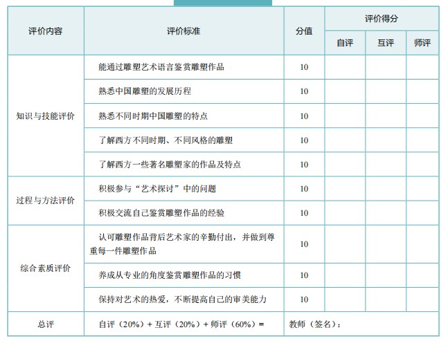 请结合下列学习评价表,通过自评、互评和师评,检测自己学习雕塑艺术鉴赏的成果。