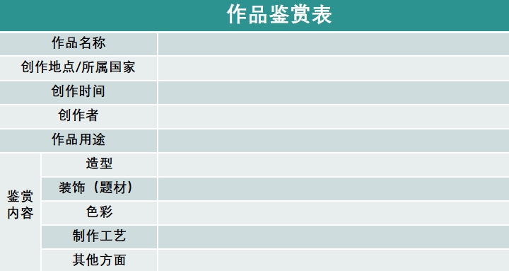 1. 无论是中国陶瓷工艺还是西方陶瓷工艺,在工业美术史上都占据着重要的地位,请分别从中国陶瓷工艺品和西方陶瓷工艺品中挑选一件作品进行鉴赏,然后填写作品鉴赏表。