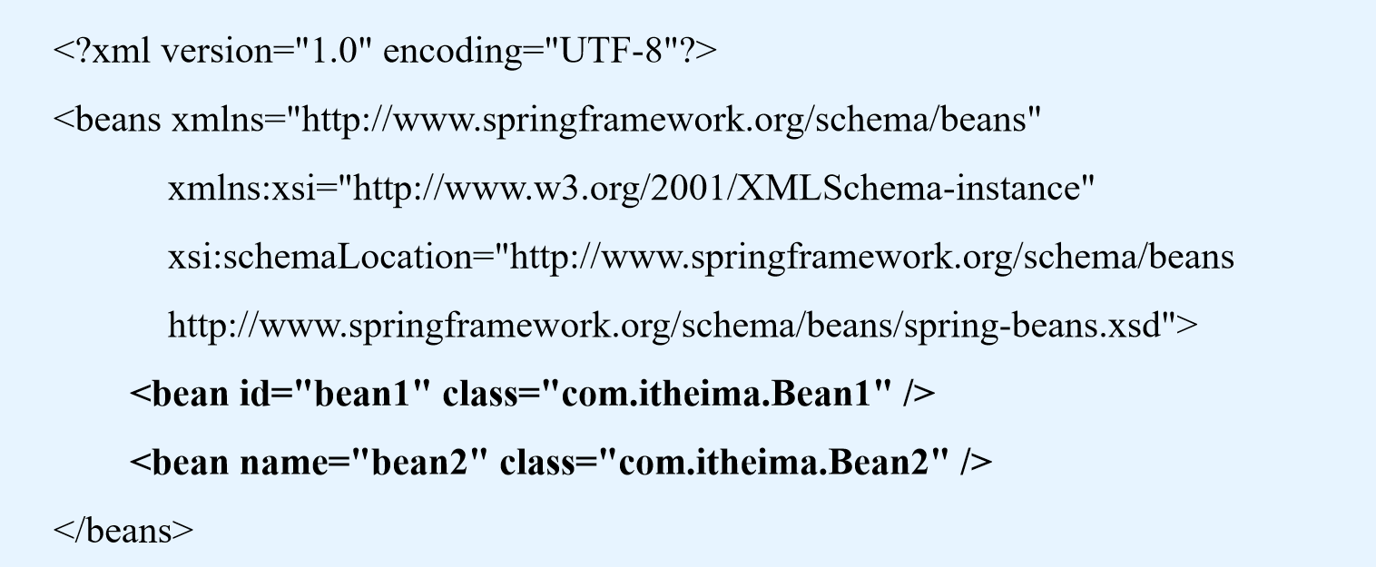 在配置文件中,通常一个普通的Bean只需要定义id(或name)和class 两个属性即可,定义Bean的方式如下所示: