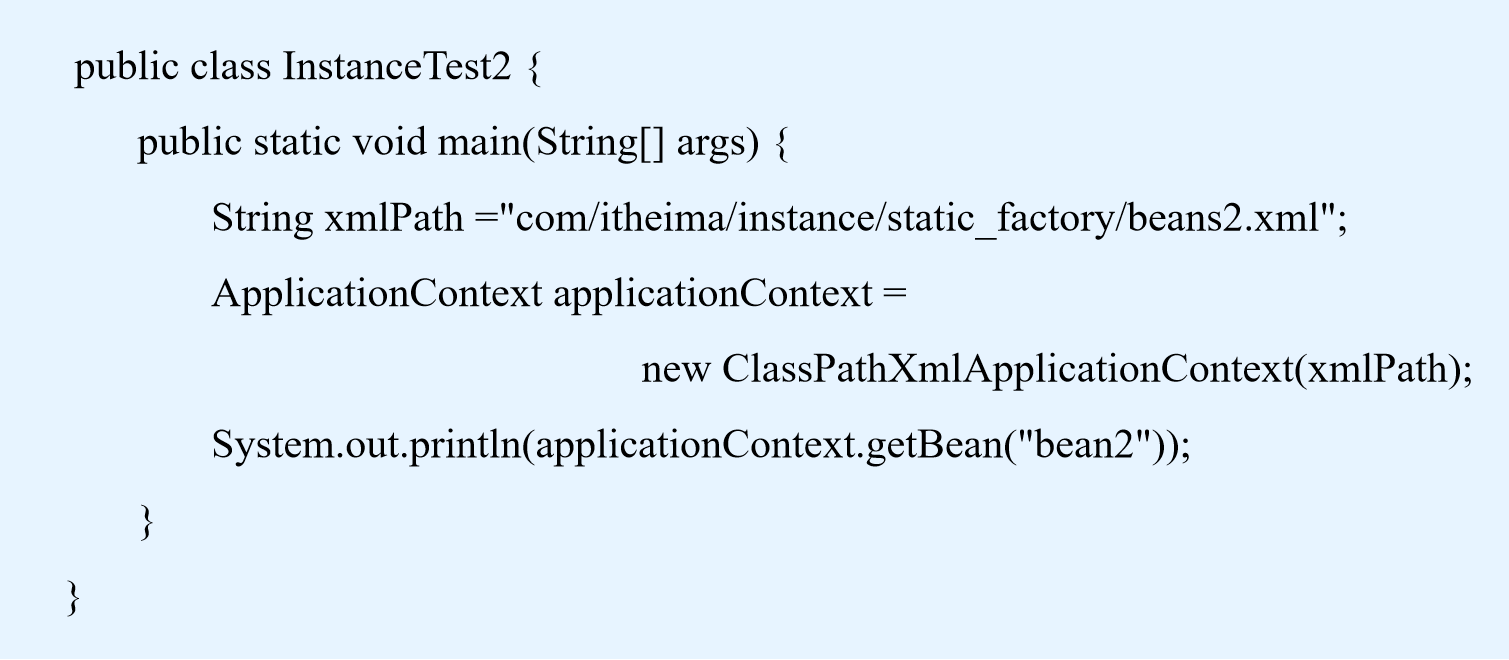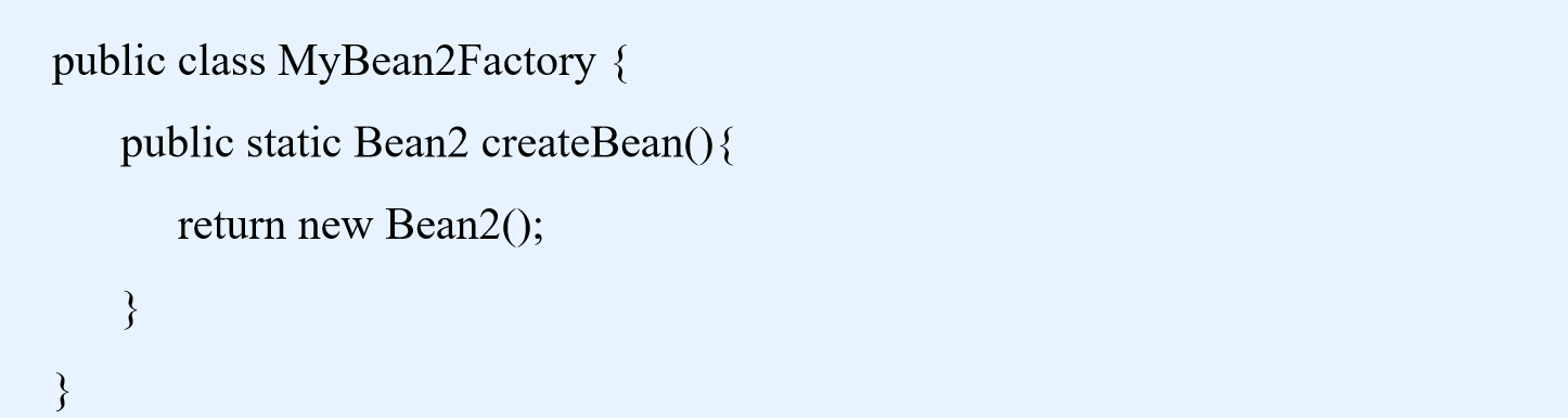 <bean id = "bean2" class = "com.itheima.instance.static_factory.Bean2Factory" factory-method = "createBean"></bean>