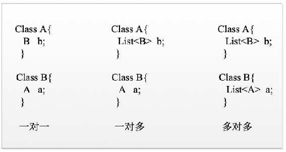 就是一个A类对象对应多个B类对象的情况,例如,定义在A类中,定义一个B类对象的集合作为A类的属性;在B类中,定义A类对象a作为B类的属性。