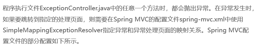 如果希望对Spring MVC中所有异常进行统一处理,可以使用Spring MVC提供的异常处理器HandlerExceptionResolver接口。Spring MVC内部提供了HandlerExceptionResolver的实现类SimpleMappingExceptionResolver。它实现了简单的异常处理,通过该实现类可以将不同类型的异常映射到不同的页面,当发生异常的时候,实现类根据发生的异常类型跳转到指定的页面处理异常信息。实现类也可以为所有的异常指定一个默认的异常处理页面,当应用程序抛出的异常没有对应的映射页面,则使用默认页面处理异常信息。
