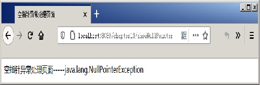 启动chapter13项目,在浏览器中访问地址http://localhost:8080/chapter13/showNullPointer,程序将执行showNullPointer()方法。方法执行后页面显示效果如图所示。
