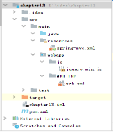 下面通过一个案例演示SimpleMappingExceptionResolver对异常的统一处理,案例具体实现步骤如下所示。在IDEA中创建一个名称为chapter13的Maven Web项目,并在项目chapter13中搭建好Spring MVC运行所需的环境。需要注意的是,如无特殊说明,本章节的所有案例都将在chapter13项目中开发和运行,chapter13项目的目录结构如图所示。