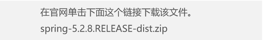 STEP 01:下载Spring的相关jar包可按如下步骤进行。使用浏览器访问Spring的官方下载地址,访问org→springframework→spring路径,就可以看到Spring框架各个版本压缩包的下载链接,这里选择5.2.8.RELEASE版本,单击链接下载该文件。