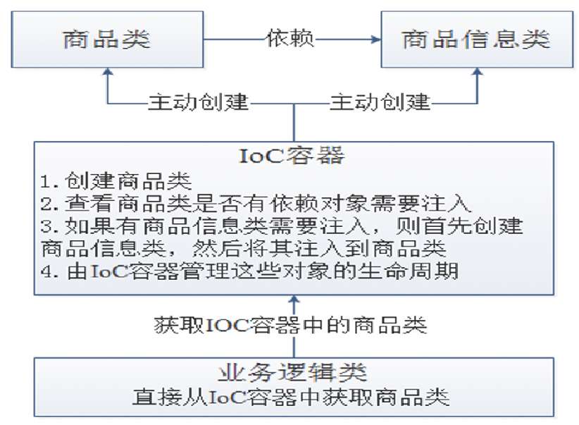 IoC控制反转机制指的是对象由Ioc容器统一管理,当程序需要使用对象时,可以直接从IoC容器中获取。这样对象的控制权就从应用程序转移到了IoC容器。IoC设计原则如图,它是借助于IoC容器实现具有依赖关系对象之间的解耦,各个对象类封装之后,通过IoC容器来关联这些对象类。