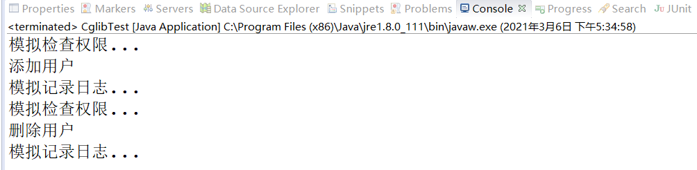 (3 )在com.itheima.cglib 包中,创建测试类CglibTest。在该类的main()方法中首先创建代理对象和目标对象,然后从代理对象中获得增强后的目标对象,最后调用对象的添加和删除方法,