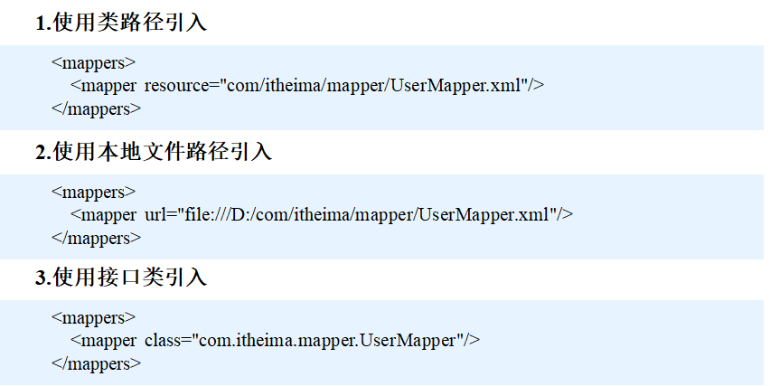 <mappers>元素用于指定MyBatis映射文件的位置,一般可以使用以下4种方法引入映射器文件,具体如下。