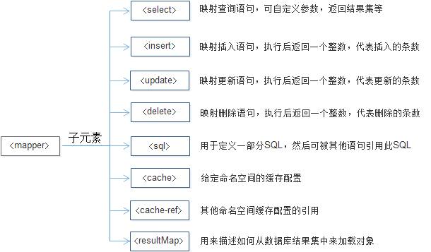 在映射文件中,<mapper>元素是映射文件的根元素,其他元素都是它的子元素。