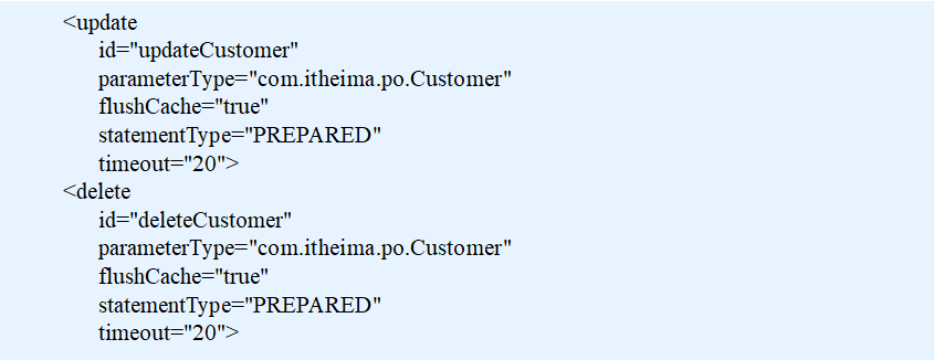 <update>和<delete>元素的使用比较简单,它们的属性配置也基本相同。