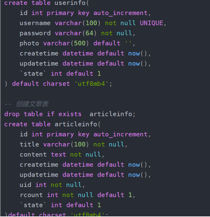 创建数据库mycnblog,创建如下表: