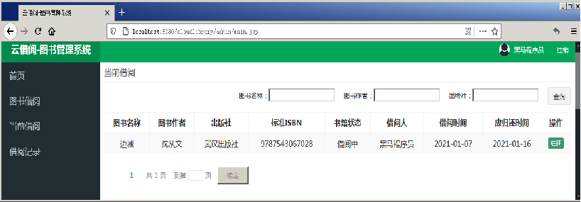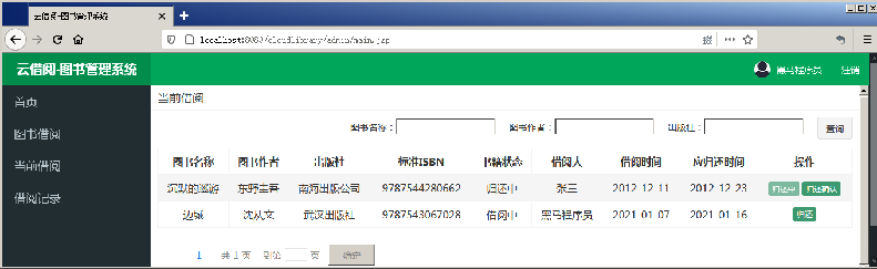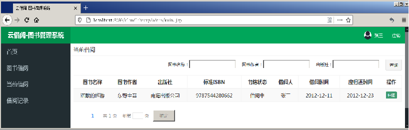 step 6:启动项目,使用管理员账号登录系统,单击导航侧栏中的“当前借阅”超链接,页面显示效果如图所示。