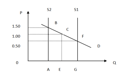 投机者通常都是采取低价时买,高价时卖的方法。在1983年,由于美国中西部干旱少雨,玉米收成较差。假设1982年和1983年这两年美国玉米市场的供给曲线如下图中的S1和S2,而这两年玉米的市场需求曲线都如同下图中的D。