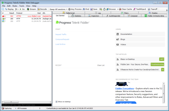 Fiddler运行主界面分为左右两栏,左边按照请求顺序显示会话列表,右边显示Fiddler工具提供的功能页签,包括Statistics、Inspectors、AutoResponse、Composer、FiddlerScripts、Log、Filters、Timeline、Fiddler Orchestra Beta九个页签,具体运行界面如下图所示。