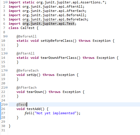 6 | @AfterEach | 表示被注解的方法应在当前类的每个@Test,@RepeatedTest,@ParameterizedTest方法之后执行; 在JUnit 4则为@After。 |