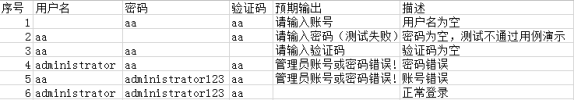 (1)、根据前面设计好的企业网站内容管理系统登陆功能测试用例集设计自动化测试的测试数据,具体测试数据如下图所示。