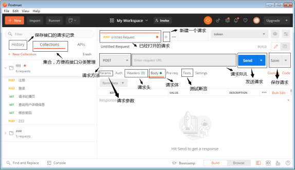 (2)侧边栏,侧边栏提供了历史(History)标签栏和集合(Collection)标签栏两个主要的标签栏。集合(Collection)在Postman里面相当于一个文件夹,可以把同一个项目的请求放在一个集合里方便管理和分享,集合里面也可以再建文件夹。