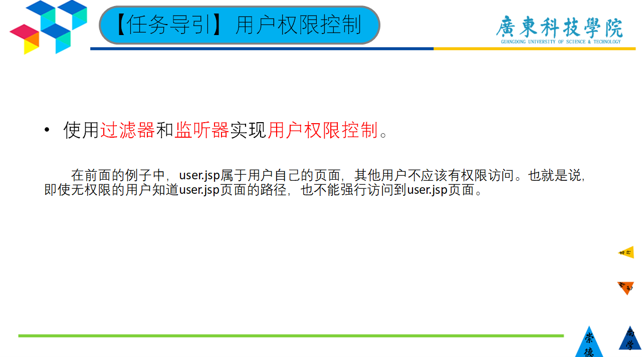 在前面的例子中,user.jsp属于用户自己的页面,其他用户不应该有权限访问。也就是说,即使无权限的用户知道user.jsp页面的路径,也不能强行访问到user.jsp页面。
