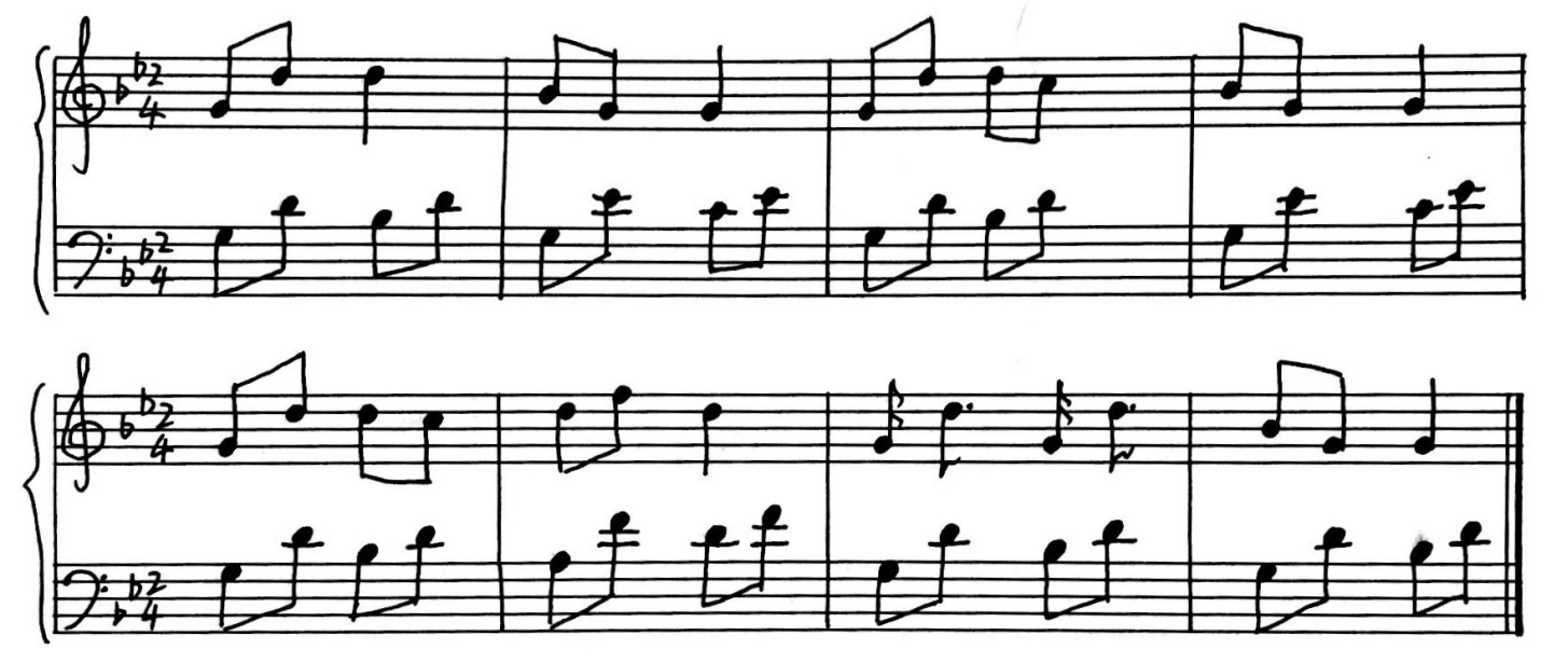 (1)b小调《大公鸡》弹唱练习: