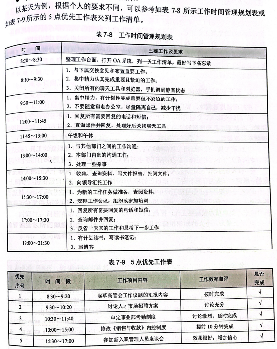 以曾经实习/兼职/放假期间的一天为例,根据自身的时间管理要求不同,完成“工作时间管理规划表”的内容(参考表7-8)和“5点优先工作表” (参考表7-9)的内容。