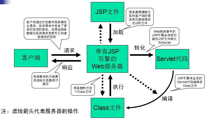 JSP文件被JSP引擎编译成Java的class文件,就是Servlet。将产生的Servlet加载到内存执行。Servlet的运行结果以HTML(或XML)形式通过Web服务器返回给客户端的浏览器。