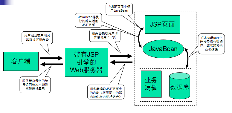 该模式是JSP程序开发经典设计模式之一,适合小型或中型网站的开发。此时的JSP除了负责部分流程的控制外,大部分用来显示页面,而JavaBean则负责业务逻辑的处理。可以看出,该模式具有一个比较清晰的程序结构,在JSP技术的起步阶段,JSP+JavaBean设计模式曾被广泛应用。