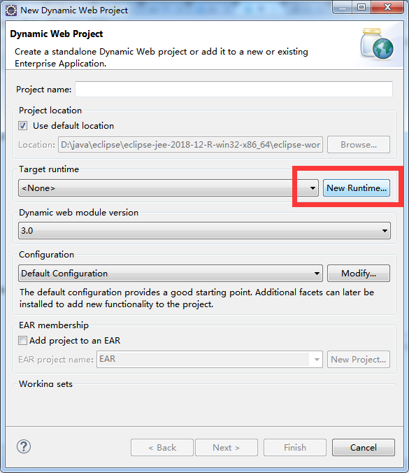 (1)打开Eclipse,选择菜单栏的“file>New>Dynamic Web Project ”,弹出窗口如下