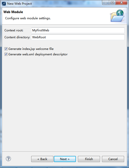 (3)连续点击“Next”进入下面界面,想要生成web.xml,就把“Generate web.xml deployment descriptor”前的选择框打勾,然后点击“Finish”,一个java Web Project 就建好了。