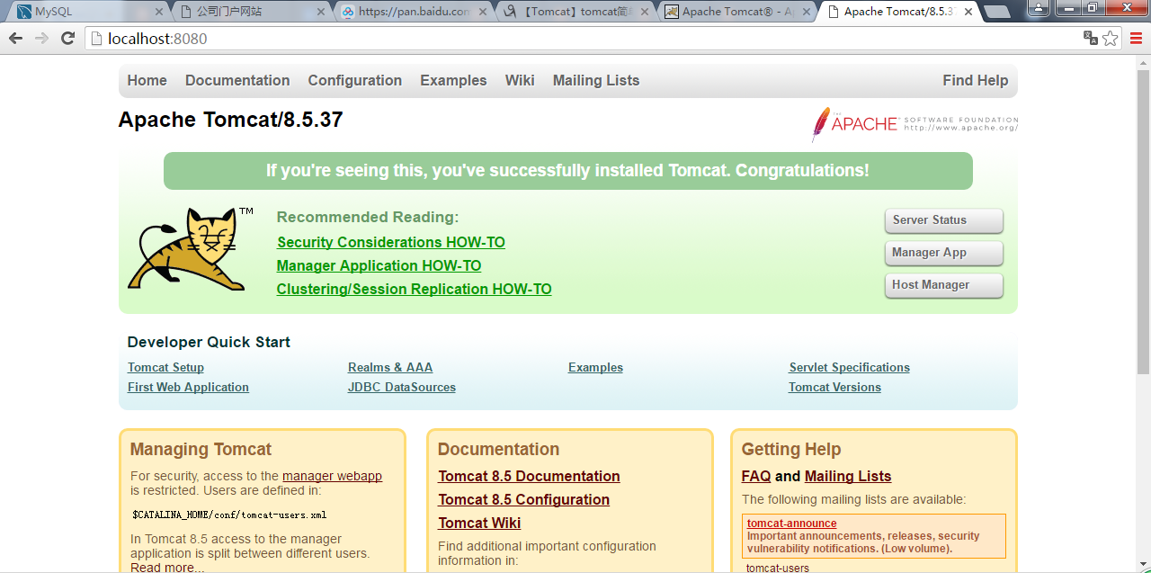 下面我们在浏览器中访问一下tomcat:在浏览器输入“http://localhost:8080/”即可,此时我们可以看到tomcat的页面了.