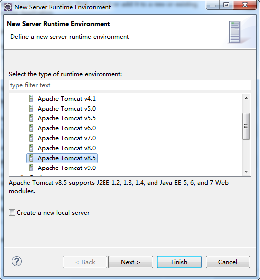 (2)点击“New Runtime”创建Server运行环境(首次需要,以后可以跳过此步)。由于我们在1.7.2中下载和使用的是tomcat8.5,所以选择“Apache Tomcat V8.5”。