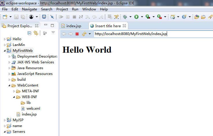 (5)输入文件名字为“index.jsp”,点击“Finish”,完成添加jsp文件,在index.jsp文件中添加代码:<h1>Hello World</h1>