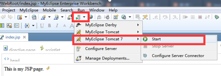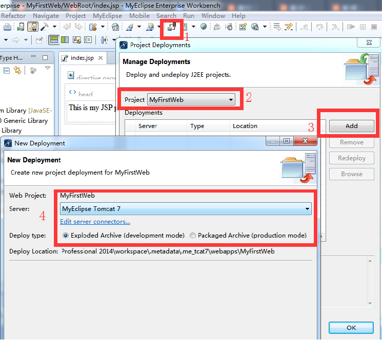 (3)部署工程到tomcat中,这里我们使用MyEclipse自带的tomcat7,也可以配置选择前面解压安装的tomcat