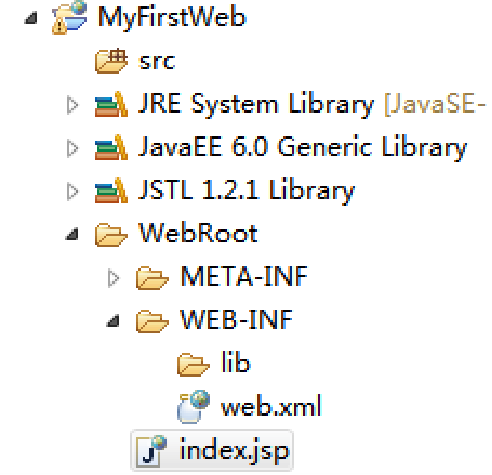 项目结构图如下(图1-36),在index.jsp的“<body></body>”文本中加入“Hello World”。