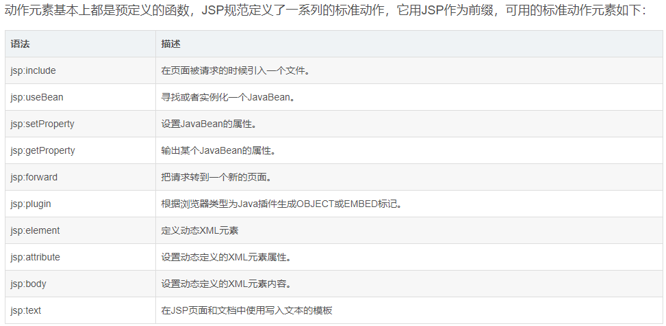 动作元素主要在请求处理阶段起作用,能够影响输出流和对象的创建、使用修改等,如动态地插入文件、调用JavaBean、页面重定向等,它按照XML语法进行书写。