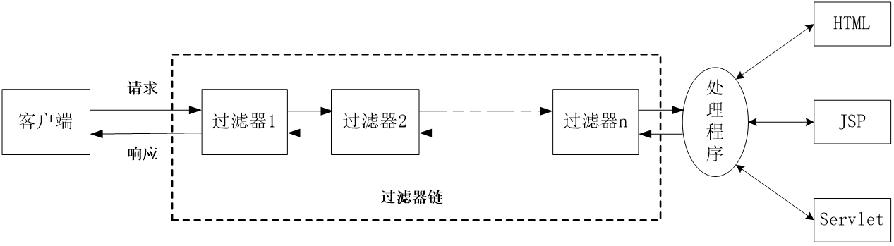 Servlet过滤器介于与之相关的Servlet或JSP页面与客户端之间,其工作原理:当某个资源与Servlet过滤器关联后,对该资源的所有请求都会经过Servlet过滤器,Servlet过滤器在Servlet被调用之前会检查请求对象(request对象),并决定是将请求转发给过滤器链中的下一个资源还是中止该请求并响应用户。若请求被转发给过滤器链中的下一个资源处理后,Servlet过滤器会检查响应对象(response对象),进行处理后返回给用户。