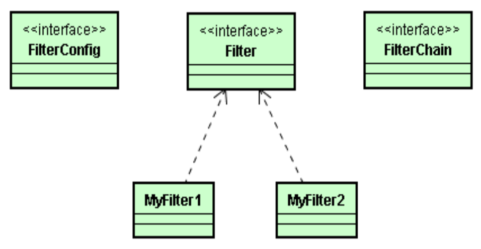 过滤器对象放置在javax.servlet包中,其名称为Filter,它是一个接口。除了这个接口外,与过滤器相关的对象还有FilterConfig对象与FilterChain对象,这个两个对象同样是接口,位于javax.servlet包中,分别为过滤器的配置对象与传递对象。实际开发中,定义过滤器只需要实现Filter接口即可,见下图