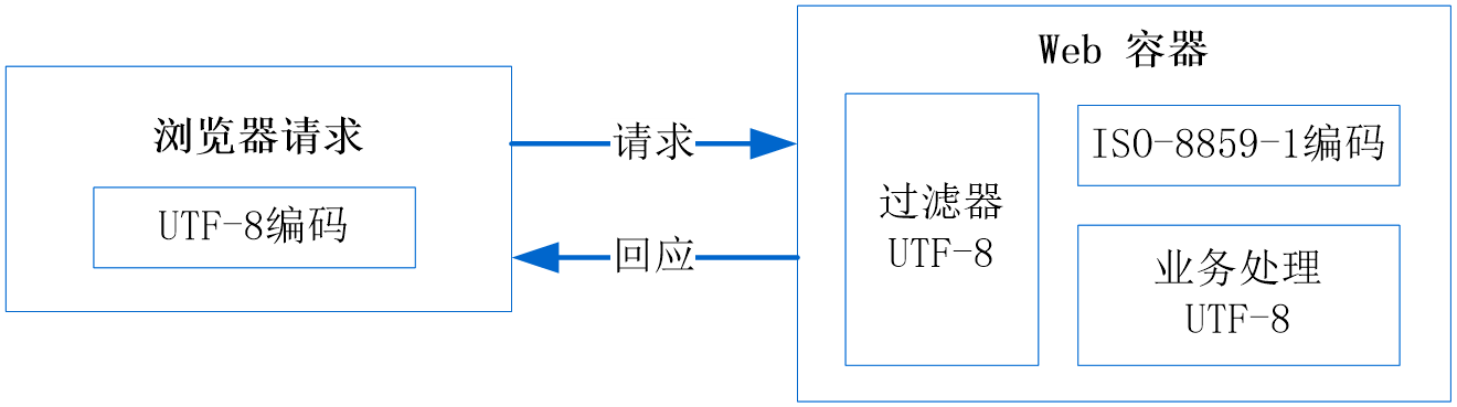 在实际开发过程中,如果通过在每一个业务处理中指定中文字符集编码,操作过于烦琐,而且容易遗漏某一个业务中的字符编码设置。如果通过过滤器来处理字符编码,就可以做到简单又万无一失,如下图所示: