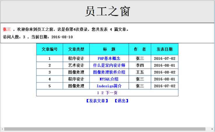 使用EL和JSTL标签,在员工之窗页面以列表的方式显示所有文章,效果如图所示。