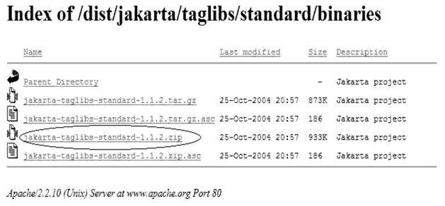 如果要想使用JSTL标准标签库,首先必须通过网址或者其它途径进行获取,读者可登录“http://archive.apache.org/dist/jakarta/taglibs/standard/binaries/”下载JSTL。版本为jakarta-taglibs-standard-1.1.2,如图所示。