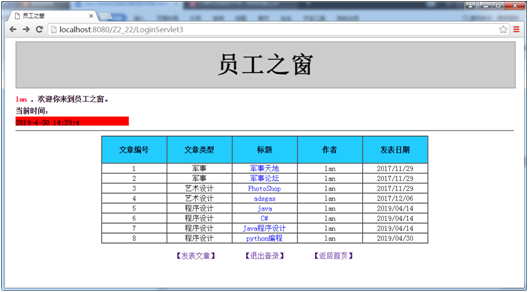 1.在员工登录入口页面中,输入用户名和密码,单击“登录”按钮,调用数据库查询(login.jsp的action链接到/LoginServlet3),如果用户名与密码正确,则调用GetAllArticleServlet类查询所有的文章并显示到员工之窗页面。