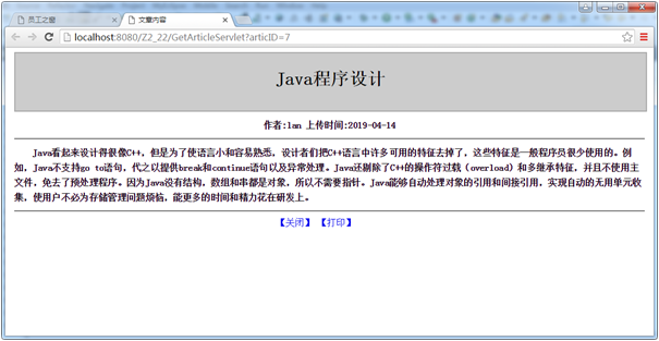 4.点击员工之窗的文章标题超链接,将展示该篇文章的详情。首先调用GetArticleServlet类,借助articID参数,将该篇文章的详情从数据库中导出,封装入article对象;然后将article对象作为页面属性传给content.jsp;最后在content.jsp页面中使用EL表达,展示文章的标题、作者、上传时间和文章内容。